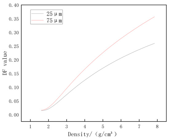 Figure 6 shows the results of the distribution of tagged particles in the cement paste under vibration, as demonstrated by the different particle sizes and densities of the tagged material groups. It can be seen that in the case of using the same tagged material, the group with a large particle size showed a greater DF value compared to the group with a small size because the mass of the particles in the group with large-sized particles was greater compared to the group with small-sized particles. When the cement paste was vibrated, the raw material particles started to vibrate by the action of vibration. As the friction between the particles and the yield stress of the slurry started to drop, the tagged particles were subjected to the action of gravity and started to move. The particles of a larger size had stronger driving forces driving them to move at a higher speed. Therefore, a larger DF value is finally presented.