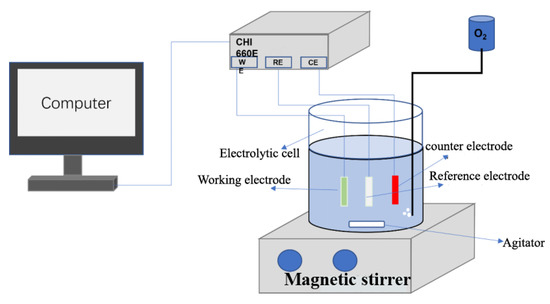 The preparation of the cathode for the electrocatalytic production of H2O2 was carried out as follows: 5 mg Co-N-C powders were well dispersed into a mixed solution of isopropanol (0.95 mL) and polytetrafluoroethylene suspension (PTFE, 0.05 mL, 60 wt%) [24]. Slurry-like specimens were formed by heating in an 80 °C water bath, and then, the resulting black slurry was uniformly coated on the nickel foam collector. The working electrode was then dried at 60 °C for 6 h and pressed into tablets for use. The schematic diagram of the electro-Fenton experimental process is shown in Figure 1.