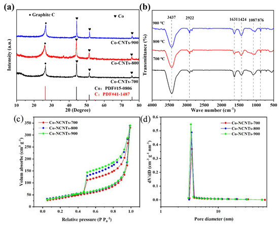 (a) XRD, (b) FTIR, (c) N2 adsorption–desorption isotherms and (d) pore size distribution patterns of Co−N−CNTs synthesized at different temperature.