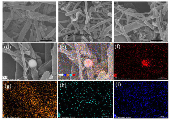 SEM images of Co−N−CNTs synthesized at different temperatures: (a) 700 °C, (b) 800 °C and (c) 900 °C; (d,e) EDS mapping images, (f) Co, (g) C, (h) N and (i) O of Co−N−CNTs at 800 °C.