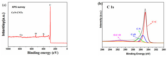 As shown in Figure 4a, the X-ray photon spectroscopy (XPS) results also confirmed the existence of Co (0.80 at%), N (3.99 at%), O (3.40 at%) and C (91.81 at%) on the Co-N-C. The Co 2p XPS spectra of the freshly prepared Co-N-C also supported the existence of Co0 (peak at 778.5 eV), as well as Co-N (peak at 780.5 eV, Co2+ (peak at 782.8 eV) and Co3+ (peak at 795.5 eV), which was consistent with the XRD result (Figure 2a). The deconvolution results of C1s of the Co-N-C included four peaks attributed to C-C/C=C (at 284.8 eV), C-N (at 285.9 eV), C-O (at 286.8 eV) and N = C–N (at 287.5 eV). The N 1s of Co-N-C was deconvoluted into four peaks (402.52 ± 0.2 eV, 401.10 ± 0.2, 399.36 ± 0.2 and 398.64 ± 0.2, respectively, shown in Figure 4c), which corresponded to oxidized N, graphitic N, pyrrolic N and pyridinic N, respectively. Previous studies have reported that the introduction of doped nitrogen in CNTS could facilitate electron transport. The introduction of C–NHx into adsorbents could also boost the adsorptive removal of organics due to its outstanding capability for hydrogen bonding [26].