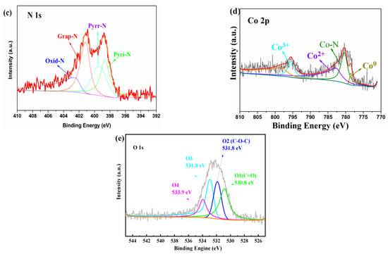 The pore distribution shown in Figure 2d proved the presence of a hybrid pore structure of a few micropores and the majority of mesopores with diameters centered at about 3 to 4 nm and BET specific surface areas of 142.89, 130.23 and 147.73 m2/g for Co-N-CNTs-700, Co-N-CNTs-800 and Co-N-CNTs-900, respectively. As shown in Figure 2c, the N2 adsorption–desorption isotherm of the Co-N-C was a type IV adsorption isotherm with a hysteresis loop at P/P0 from 0.4 to 0.5, which also indicated the irregular hybrid pore structure of micropores and mesopores in the Co-N-C.
