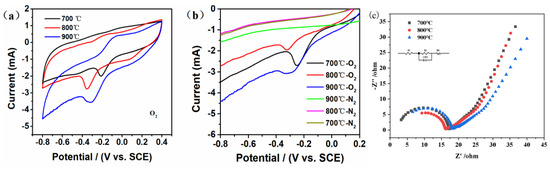 Electrochemical performance evaluation of the Co−N−C electrode synthesized at 700 °C, 800 °C and 900 °C under oxygen saturation condition. (a) CV, (b) LSV and (c) AC impedance spectroscopy.