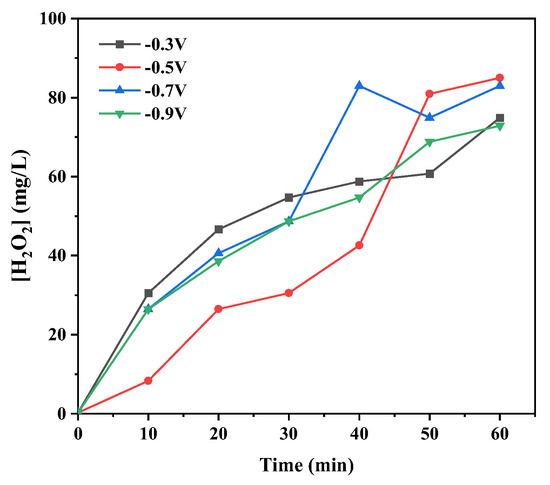 The yield of H2O2 was measured for the Co-N-C electrode synthesized at 800 °C under different applied voltages (as shown in Figure 6). There was little difference between the yield of H2O2 under different applied voltages, and the yield of H2O2 could reach 80 mg/L/h within 60 min, which was higher than that in many reported studies. From the literature, we know that a higher voltage can promote proton-coupled electron transfer in the formation of H2O2, while a side reaction of HER will also be promoted under higher voltages. Considering the influence of energy consumption and the HER side reaction, the optimal voltage for H2O2 yield in this system was −0.7 V (vs. SCE).