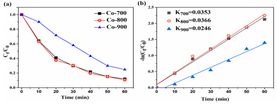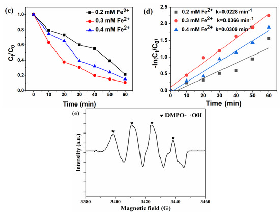 The E-Fenton degradation efficiency of different systems for the removal of RhB was explored. Figure 7a shows that all the Co-N-C displayed efficient E-Fenton degradation rates of RhB, while that synthesized at 800 °C exhibited the highest RhB degradation (91% removal in 1 h). The reaction rate constants for the Co-N-C synthesized at 700 °C, 800 °C and 900 °C were 0.0353, 0.0366, and 0.0246, respectively. Figure 7c shows that all the Co-N-C displayed efficient E-Fenton degradation rates of RhB, while that synthesized at 800 °C exhibited the highest RhB degradation (91% removal in 1 h). The reaction rate constants for the Co-N-C system with different Fe2+ additions at 0.2 mM, 0.3 mM and 0.4 mM were 0.0228, 0.0366 and 0.0309, respectively. The highest RhB degradation rate was obtained with 0.3 mM Fe2+. During this process, the •OH could be generated from both the Co2+/Co3+ cycle and the Fe2+/Fe3+ cycle, which quickened the degradation of the RhB due to the Co-Fe synergy effect. An increase in Fe2+ concentration can promote the Fenton reaction to produce more ·OH, while an excess of Fe2+ will compete electrons with ·OH and reduce the contact of ·OH with organic compounds, which will lead to a decrease in the degradation efficiency of RhB.