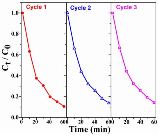 The reusability of Co-N-CNTs was studied by fulfilling cycling tests. As shown in Figure 8, after three cycling runs, the degradation efficiency of RhB decreased from about 89.4% to 85.8%, and the degradation rate of RhB only decreased by about 4%, which proved that the Co-N-CNTs had very good reusability. The above result indicates that during the process of RhB degradation, the Co nanoparticles were tightly embedded in the carbon nanotube and drove a Co2+/Co3+ cycle to facilitate the E-Fenton degradation of RhB.