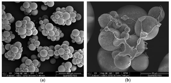 In our previous studies [52], we used quite a high amount of PVA to prevent of agglomeration of the synthesized microspheres and obtain a required diameter of the final beads. However, this approach led to some problems with the entire removal of the stabilizer from the porous surface of the product. Consequently, in the presented study, we conducted preliminary research focused on well-adjusted quantity of the stabilizer. The weight percentage of PVA in water was increased from 0.1 to 2.5 wt.%. It came out that application of a low PVA concentration resulted in agglomerated microspheres (Figure 1a). In the case of BMA copolymers, 1.5 wt.% of PVA turned to be sufficient for protection of the resulting microspheres and therefore this amount of stabilizer was used in further synthesis. It was stirred with water in a three-necked flask for 6 h at 80 °C. After dissolving PVA, the organic solution of 15 g of the monomers (BMA with addition of a given comonomer), 0.075 g of an initiator (AIBN), and 22.5 mL of the diluent (toluene or chlorobenzene) was made and slowly put into the stirred aqueous medium. The molar ratio of DMA to a comonomer was kept 1:1 in the first series of synthesis; in the second, the molar ratio was 1:4. In order to obtain copolymers with highly developed internal structure, toluene and chlorobenzene were used as pore-forming diluents. The copolymerization process continued for 20 h at 80 °C. Porous microspheres obtained in this process were collected, filtered, washed with hot water and subjected to an intensive cleaning procedure described by Tuncel [59]. However, even this careful cleaning was not sufficient for complete removal of the stabilizer (Figure 1b). The purified copolymers were dried in a vacuum exsiccator at 60 °C. Table 1 delivers the designations of the obtained copolymers along with the main experimental parameters.