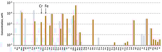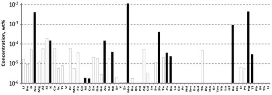 To grow a crystal-etalon, we utilized the commercially available WO3 chemical from “LANHIT, Ltd.” (Moscow, Russia), for which the declared purity was 5N. The impurity composition of this chemical, measured by ICP-MS, is presented in Figure 2.