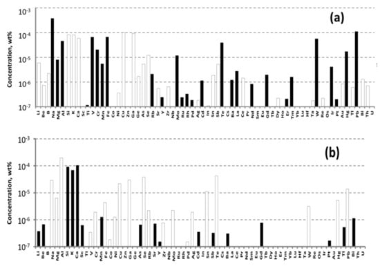 The main impurities that were revealed here were, again, molybdenum, rhenium, alkali ions and arsenic: their concentrations were much higher in this chemical, reaching values of 10−2 wt% (100 ppm). The concentrations of Cr and Fe ions were below the LDs: 0.8 ppm for chromium and 0.6 ppm for iron.