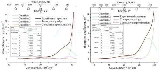 We decomposed the absorption spectra into elementary Gaussians using the Microcal®Origin® 8.0 software. We applied the same set of the Gaussians (the same combinations of peak positions and FWHMs ) for both crystals. In order to approximate the broad weak shoulder at 16,000–24,000 cm−1 (450–550 nm), we used the sum of two separate Gaussians. The values of peak positions and of these two Gaussians have been fixed (without any variations) on the peak positions of Fe2+ and Cr3+ absorption bands, at wavelengths of 460 nm (21,740 cm−1) and 510 nm (19,610 cm−1), respectively, according to the literature data [10,22,24]. The peak position of the third, much stronger and slightly narrower Gaussian, , was varied. The position was optimized in the frame of the approximation to be ~27,870 cm−1 (359 nm). This value is close to the literature data on Fe3+ absorption peak position [26,29]. The values of for all Gaussians were also varied and have been optimized to the frame of the approximation (see insets in Figure 6).