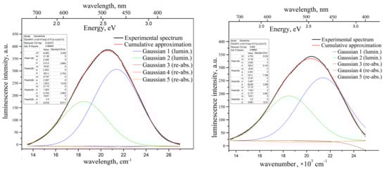 In order to evaluate the reabsorption influence on the photoluminescence bandshape, we have also introduced the main three optical absorption Gaussians into the approximation model with “negative” intensities. The results of the approximation show that influence of the reabsorption is negligible for the “pure” crystal (see Figure 7).