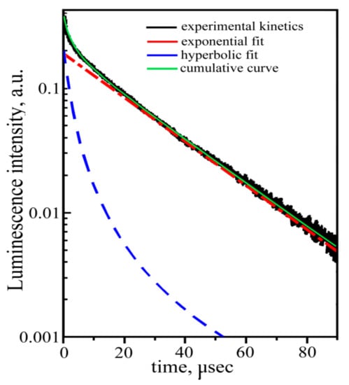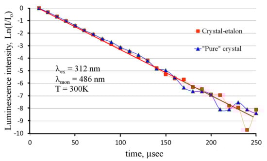 In this case, the cathodoluminescence intensity of the crystal-etalon is ~1.5 times higher than that of the “pure” crystal, in contrast to the ratios of the photo- and X-ray luminescence intensities. To reveal the mechanisms of cathodoluminescence, we measured the decay kinetics for both crystals under study. The revealed kinetics are practically the same for both crystals, just as in the case of the photoluminescence decay kinetics. The kinetics for a “pure” crystal are shown in Figure 12.