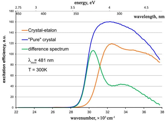4. In the difference between the excitation spectra for the “pure” crystal and the crystal-etyalon, one can clearly see the superposition of two bands close to the Gaussian shape: a stronger and narrower band with a maximum of ~30,600 cm–1 (327 nm, 3.79 eV), as well as a weaker and broader band with a maximum at ~33,600 cm−1 (298 nm, 4.16 eV). Two assumptions are possible: (1) These bands correspond to additional excitation centers present in the “pure” crystal and absent or greatly reduced in the crystal-etalon. After absorbing the photons of the exciting light, these centers transfer the energy of their excited state to the [WO6] clusters; (2) These bands belong to parasitic absorption centers in the crystal-etalon. They are probably associated with accidental impurities in the crystal.