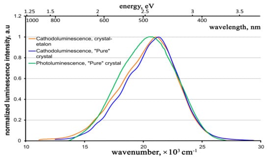 The normalized cathodoluminescence spectra for both the crystals under study are given in Figure 11, along with the photoluminescence spectrum for the “pure” crystal.