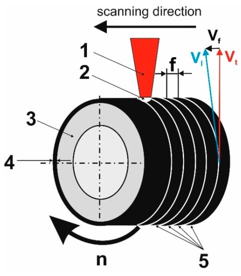 The scheme of laser-alloying by re-melting: 1—laser beam; 2—molten pool; 3—specimen (Inconel®600-alloy); 4—pre-coated paste with alloying material; 5—the multiple laser tracks; vf—feed rate; vl—scanning rate; vt—tangential speed; n—rotational speed; f—distance between the axes of adjacent tracks.