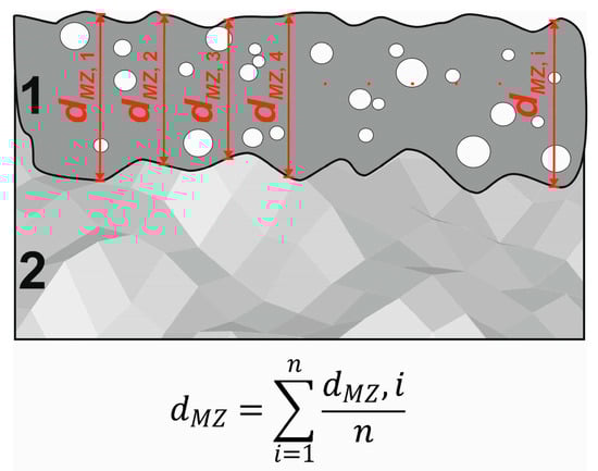 The observations of the microstructure were performed using an optical microscope (OM) LAB-40 (OPTA-TECH. Poznan, Poland) and a scanning electron microscope (SEM) Mira 3 (TESCAN, Poznan, Poland) equipped with an Energy Dispersive Spectrometer (EDS). For investigations, the laser-alloyed samples were first cut across the produced layers in the direction perpendicular to the surface. Such prepared cross-sections were mounted in a conductive resin, ground with SiC abrasive paper, polished with Al2O3 paste, and then etched with Marble’s reagent. The thicknesses of laser-alloyed layers were calculated as an average value from about 100 measurements carried out in different locations of the cross-section of metallographic samples. In the case of the laser treatment applied, the re-melted zone (MZ) was observed close to the surface, and no changes in the microstructure were noticed below this zone, where the heat-affected zone (HAZ) should occur. Therefore, the depth of the re-melted zone (dMZ) was assumed to be the thickness of the laser-alloyed layer. The diagram of the measurements and calculation of the average thickness is shown in Figure 2. The surface percentage of WC particles in the microstructure of the layers was determined using binary images prepared on the basis of OM images of the cross-sections of the layers.