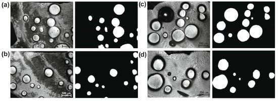 Four selected OM images and their binary images showing the microstructure of the laser-alloyed layer produced with a laser beam power of 1.82 kW: (a) area 1, (b) area 2, (c) area 3, (d) area 4.
