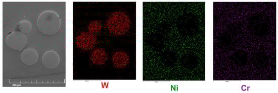 SE image and EDS mapping of tungsten, nickel, and chromium performed for a laser-alloyed layer produced with a laser beam power of 1.3 kW.