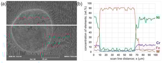 The presence of WC particles was detected for all the layers produced (Figure 2). To ensure that the decomposition of these strengthening phases did not occur during the laser re-melting, EDS mapping was performed for the layer produced with a laser beam power of 1.3 kW (Figure 7). It was observed that the WC particles were characterized by an increased concentration of tungsten. While in the matrix, no elevated concentration of this element was detected. However, a slight amount of tungsten was detected in some areas near the interface between the WC particles and the matrix. To confirm this phenomenon, a linear EDS microanalysis was performed along a straight line across a single WC particle (Figure 8). It was clearly visible that the WC particle was characterized by a high concentration of tungsten. On the boundary between the WC particle and the matrix of the laser-alloyed layer, the region with an increased concentration of tungsten (25–28 wt.%) appeared. In this region, a reduced concentration of nickel (50–57 wt.%) was observed compared to the matrix of the laser-alloyed layer. Such a profile of tungsten concentration indicates partial decomposition of the tungsten carbide during the laser beam action. This phenomenon was also observed in the case of high-speed laser cladding of a WC/Ni-based coating [14].