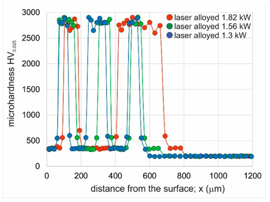 In order to prepare microhardness profiles, measurements were carried out along a straight line perpendicular to the surface at different distances from the surface. Tests were performed across the laser-alloyed layers using a Micromet II hardness tester (BUEHLER, Poznan, Poland) equipped with a Vickers diamond indenter under a load of 25 gf (0.245 N).