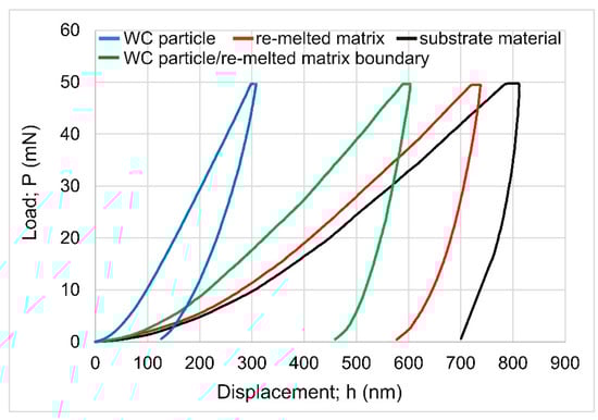 Nanomechanical properties (indentation hardness and indentation Young’s modulus) were estimated based on the load-displacement curves. To calculate indentation moduli (EIT), the appropriate values of the Poisson ratio had to be assumed. For the substrate material and the re-melted matrix, the average value νs = 0.316 was taken based on the literature data [22] concerning Inconel®625-alloy (νs = 0.314–0.318). In the case of WC particles, the Poisson ratio νs = 0.194 was assumed [23]. The selected representative curves recorded for the WC particle, WC particle/matrix boundary, matrix, and substrate material are shown in Figure 11. The curve representing the WC particle was significantly different from the others presented in Figure 10. First, the maximum penetration depth was the lowest (hmax = 309 nm). As a result, the highest indentation hardness (HIT = 33.79 GPa) and the highest indentation Young’s modulus (EIT = 598.81 GPa) were measured for the WC particle. Second, the shape of the unloading part of the curve was similar to the loading part, which indicates the highest resistance to indentation among all the tested areas. The average indentation hardness and Young’s modulus measured in the WC particle were 31.25 GPa and 609.33 GPa, respectively. The lowest average values of HIT (2.85 GPa) and EIT (216.45 GPa) were obtained in the substrate material (Inconel®600-alloy). The differences between the load-displacement curves (Figure 11) indicated that the region at the boundary between the WC particle and the matrix was characterized by higher values for nanomechanical properties compared to the matrix of the laser-alloyed layer. The average indentation hardness and Young’s modulus measured in the region at the WC particle/matrix boundary were 6.89 GPa and 280.29 GPa, respectively. These values were significantly higher than those obtained in the matrix of the laser-alloyed layer (HIT = 3.95 GPa, EIT = 233.21 GPa). The reason for these differences was the increased concentration of tungsten in the region at the boundary between the WC particle and the matrix, as well as the fine-grained dendritic microstructure of this area.