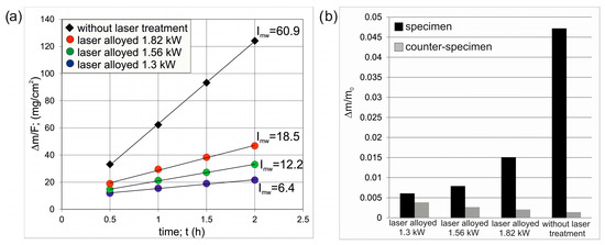 Results of wear resistance tests: (a) mass loss of specimens on a unit of friction surface vs. time of friction with calculated Imw factors, (b) relative mass loss of specimens and counter-specimens.