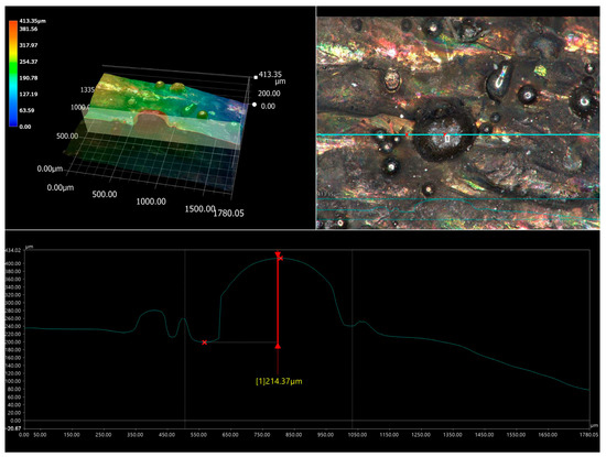 Due to the presence of high-hardness ceramic particles (WC) in the matrix of laser-alloyed layers, and simultaneously due to the specific mass transfer in the molten pool during laser treatment, a 3D image of the surface topography of the layer produced at a laser beam power of 1.3 kW was determined. The observations were carried out using a VHX7000 digital microscope (KEYENCE, Poznan, Poland).