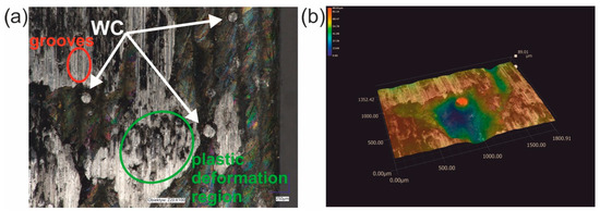 After the wear resistance test, the surface of the laser-alloyed Inconel®600-alloy was characterized by the presence of visible signs of abrasive wear (Figure 15a). Smooth grooves were clearly visible in some areas of the worn surface of the laser-alloyed specimen (Figure 15a). This confirmed the presence of abrasion during the test. However, the abrasive wear mechanism was not the only mechanism occurring during the wear. In some areas the signs of plastic deformation occurred. Moreover, in areas where the plastically deformed surface was visible, small particles pressed into this surface were also noticeable. The presence of such particles was also observed in the case of WC/Inconel®625 coatings produced by laser melting deposition [19]. These particles were found to have resulted from the breaking of some of the carbides during the wear test. Therefore, in the present study, it was concluded that the presence of fine particles pressed into the plastic deformation region resulted from the breaking of WC particles during the wear resistance test under a high load of 149 N. It is important to note that that not all WC particles were broken during the wear resistance test. In Figure 14, three tungsten carbide particles were still visible. When the 3D image of the surface topography (Figure 15b) was analyzed, it was clearly seen that these particles still protruded above the nominal surface. The height of the representative WC particle was estimated from a cross-section of the 3D image of the surface topography and a 2D profile across the WC particle (Figure 16). These results confirmed that the WC particles that did not break during the wear test are still higher than the nominal surface of the specimen. Obviously, the WC particles that protruded above the surface of the specimen at the beginning of the wear test play an important role during the wear test.