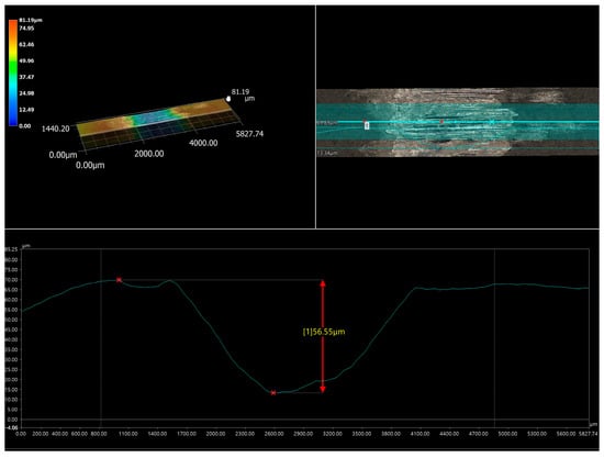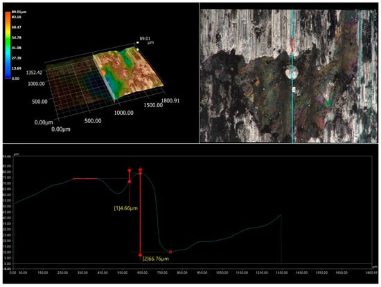 The specific behavior of the WC particles during the wear resistance test caused a high relative mass loss of the counter-specimen mating with the specimen laser-alloyed with a laser beam power of 1.3 kW (Figure 12b). The analysis was performed after the first half hour of the test as the counter-specimen was changed every half hour. The worn surface of the counter-specimen was characterized by the presence of deep grooves (Figure 18a). Analysis of the worn track of this counter-specimen (Figure 18b) provided information about its width and shape. The average width of the worn track was 2.1 mm, and the shape of this track was related to the shape of the mating specimen. The ring-shaped specimen caused the worn track formed on the surface of the counter-specimen to be a negative of this shape (Figure 19). The maximum depth of the worn track in relation to the nominal surface of the counter-specimen was 56 µm. The presence of deep grooves on the worn surface of the counter-specimen was caused by the WC particles protruding above the surface of the mating specimen. The cross-section of the 3D image of the surface topography and the 2D profile across the grooves formed on the surface of the counter-specimen mating with specimen laser-alloyed with a laser beam power of 1.3 kW are presented in Figure 20. The maximum depth of the representative groove was 21.62 µm.