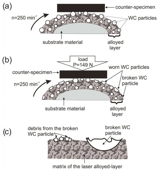 Schematic model of the wear behavior of the laser-alloyed layer produced on Inconel®600-alloy: (a) the contact between the specimen and counter-specimen, (b) first stage of wear, (c) details of the area with a broken WC particle and debris pressed into the matrix of the layer.