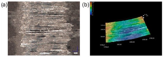The surface morphology of the counter-specimen mating with the specimen laser-alloyed with a laser beam power of 1.3 kW: (a) image recorded by the digital microscope, (b) 3D image of the surface topography.