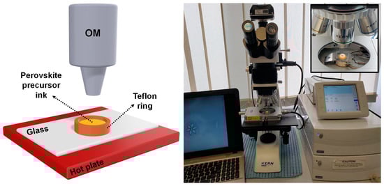 The following experimental setup was used to study perovskite crystal formation. A Teflon ring with a 3 mm diameter and a 2 mm height was mounted and glued on a standard microscope glass slide. The setup was further treated in a UV ozone cleaner and placed on a Linkam THMS600 hot stage under an OM. The temperature of the hot stage could be adjusted and controlled with high precision between 40 °C and 110 °C (the hot stage is capable of regulating the temperature from 600 °C down to −196 °C when liquid nitrogen is utilized). Finally, 5 µL of the lead-mixed halide perovskite solution was injected in the Teflon rings and evenly spread over the glass substrate, leading to a solution of a thickness of about 700 µm (this value was deduced by considering that a 5 µL of perovskite solution represents a volume of about 5 mm3 and that the diameter of a used Teflon ring is 3 mm). A KERN OKN-177 OM with a 20× objective was used to observe the growth of perovskite crystals in real time and direct space (while maintaining the hot plate at a chosen constant temperature). The whole experimental setup is schematically represented in Figure 1. The solvent evaporation rate was mainly dictated by the processing temperature of the perovskite sample. Nonetheless, other physical parameters, such as the temperature of the perovskite solution and the room temperature and humidity, needed to be to controlled in order to perform comparable and reproducible experiments. To that end, the room temperature was regulated at 24 °C at all time via an air conditioning system, while the perovskite solutions were kept in the fridge at 5 °C prior to use.