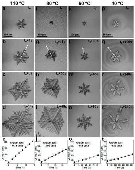 Optical micrographs depicting sixfold symmetrical perovskite crystals grown from a hybrid lead-mixed halide CH3NH3PbI3–xClx perovskite precursor ink at processing temperatures of 110 °C (a–d), 80 °C (f–i), 60 °C (k–n) and 40 °C (p–s) and at corresponding growth rates of 9.74 µm/s (e), 3.06 µm/s (j), 0.64 µm/s (o) and 0.19 µm/s (t), respectively. The white dotted arrows indicate the direction along which the growth rates were determined. The dashed lines in (e,j,o,t) are linear fits to the data points. Their corresponding slopes indicate the average crystal growth rates. Note that t0 is different for each temperature.