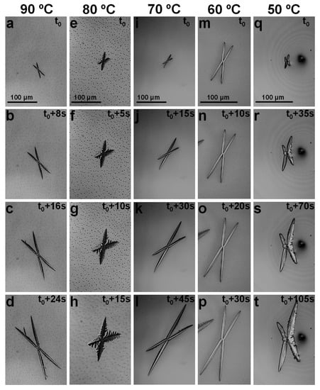 Interestingly, besides the perovskite crystals exhibiting a sixfold symmetry, other “X”-like crystals displaying a fourfold symmetry were also observed (Figure 3). This only occurred in the temperature processing range of 50 °C to 90 °C, and no “X”-like crystals were observed outside this range. While “X”-like crystals were observed to nucleate and grow independently of each other, their branching was rather limited, with more branching visible in crystals grown at 80 °C (Figure 3e–h). Furthermore, because the crystal branching seems to become more visible at later crystal growth stages, when, very often, crystals undergo a coalescence process, a direct correlation between the processing temperature and the degree of crystal branching is not yet possible to establish. Additionally, as determined from Figure 3, the crystal growth rates increased with the increase in processing temperature from ~2.24 µm/s (Figure 3q–t) to ~3.15 µm/s (Figure 3m–p), ~4.73 µm/s (Figure 3i–l), ~5.73 µm/s (Figure 3e–h) and ~6.69 µm/s (Figure 3a–d). These rates, despite the increased processing temperature, are much higher than the growth rates corresponding to the crystals exhibiting sixfold symmetry (shown in Figure 2e,j,o,t). For instance, while a fourfold “X”-like crystal grew at a rate of ~3.15 µm/s at 60 °C, a sixfold crystal grew at a rate of only 0.64 µm/s in the same sample and at the same temperature. Similarly, at 80 °C, the corresponding growth rates were ~5.73 µm/s and ~3 µm/s for the fourfold and sixfold symmetrical perovskite crystals, respectively. This suggests that the sixfold symmetrical crystals are of higher quality and could possibly exhibit puzzling optoelectronic properties, assuming their slower growth and the already demonstrated beneficial effects of the crystalline microstructure of mixed halide perovskites on their optical and photovoltaic properties [76]. To prove this tentative statement, future experiments are necessary to assess the internal structure of such crystals.