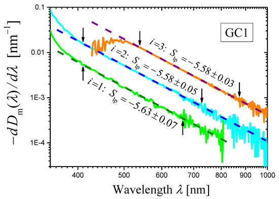 It should be noted that the initial spectra of the measured optical densities presented in Figure 4a were recorded with the step . They were used for the construction of Figure 4b. However, the differentiation of these spectra led to strong oscillations. To reduce oscillations of the derivatives, we recalculated the initial spectra to a step (also see Section 3.2). The derivatives of the recalculated spectra are shown in Figure 5 as functions of wavelength in a log–log scale. One can see that certain portions of the curves may be presented as straight lines. In the ranges limited by arrows in Figure 5, each curve was approximated by a straight line using the least squares method. The results of the approximation are presented by dashed straight lines, and the slopes of the lines are indicated. Using these slopes and Equation (14), we can write the scattering exponent values obtained by the novel method as: