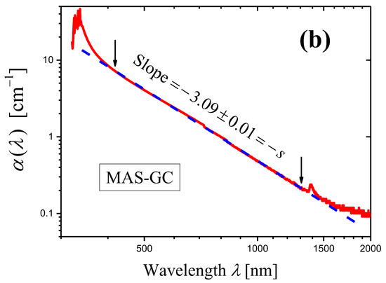 The optical density was measured with the wavelength step for two samples of the MAS-GC of thickness and (Figure 4a). The results of these measurements were used for calculation of extinction coefficient by Equation (5) (the first method). The dependence is shown in Figure 4b as a log–log plot.