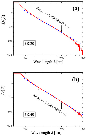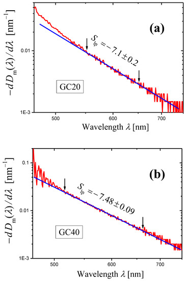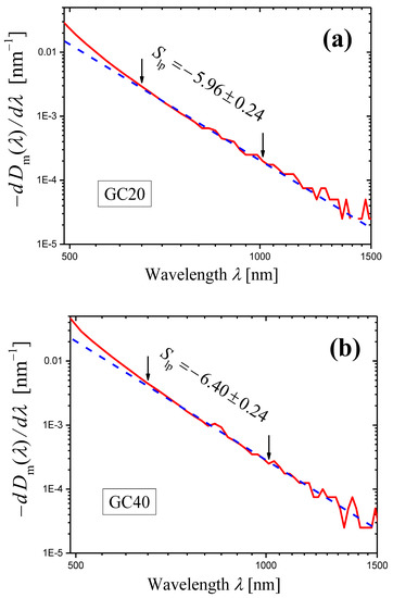 For the glass-ceramics GC20 and GC40, the derivatives of measured optical densities as functions of wavelength are shown in Figure 6 in the form of log–log plots. Certain portions of the curves may be presented as straight lines. In the ranges limited by arrows in Figure 6, each curve was approximated by a straight line using the least squares method. The results of the approximation are presented by straight lines, and the slopes of the lines are indicated. Using these slopes and Equation (14), we can write the scattering exponent values obtained by the novel method as: