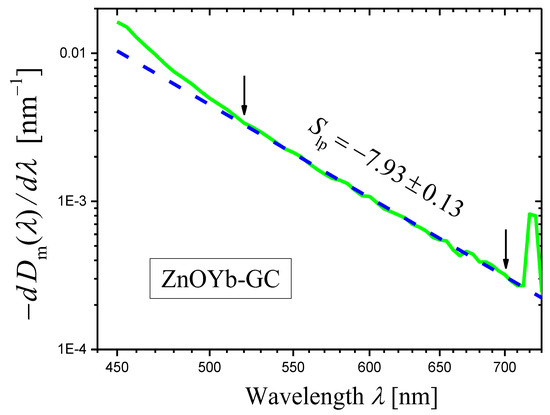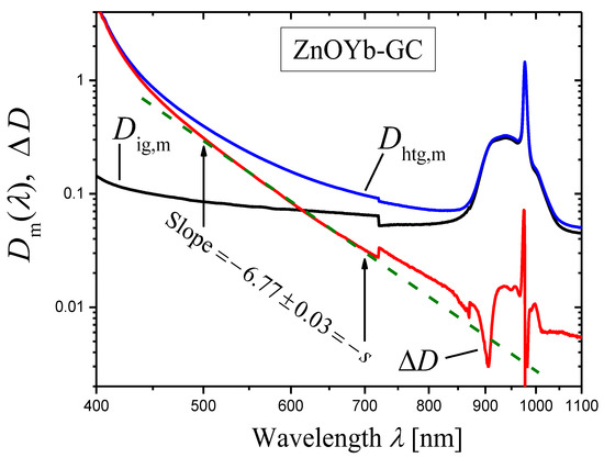 Optical densities of the sample of the initial glass (with thickness ) and of the sample of the ZnOYb-GC (with thickness ), see Equation (7), were measured with the wavelength step . Then, their difference (Equation (8)), which is proportional to the extinction coefficient (Equation (9)), was calculated (Figure 8, the log–log plot). In the wavelength range ≈ 500–850 nm, the curve of in Figure 8 demonstrates a linear portion ascribed to light scattering. The slope of this linear portion was determined by the least squares method in the spectral range shown by arrows and was found to be equal to −6.77 ± 0.03. Thus, one can state that the scattering coefficient is described by Equation (1) with the scattering exponent value