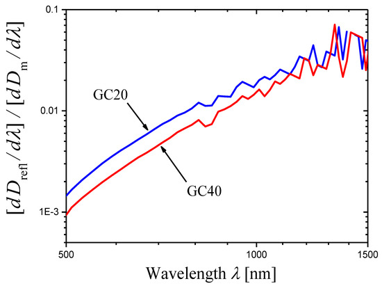 In the case of GC20 or GC40, the curves of and plots cannot be distinguished in the scale of Figure 11 at . The reason is that the optical density of reflection losses changes with wavelength much more slowly than the optical density corresponding to light scattering. For illustration, we calculated the ratios for GC20 and GC40 (Figure 14). Figure 14 shows that both ratios do not exceed 2% for wavelengths . Thus, the curves plotted with and without consideration of the wavelength dependence of optical density of reflection losses practically coincide if the wavelength is not too long.