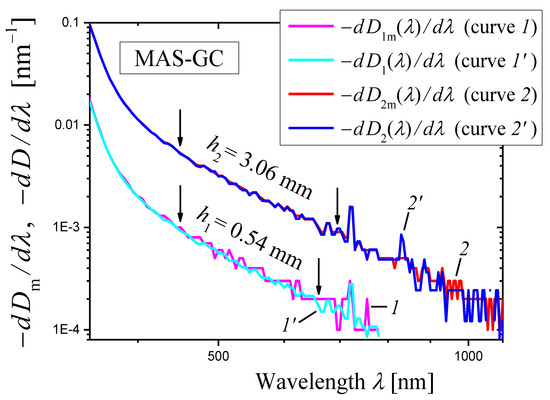 - The internal optical densities of the thick and thin samples calculated by Equation (36) differ only by a constant factor: . The similar equation also applies to derivatives: . Thus, in the logarithmic representation (Figure 15), the curve of (curve 1′) can be obtained by shifting the curve of (curve 2′) along the y-axis. Figure 15 confirms this conclusion. A slight difference in slopes of curves 1′ and 2′ (see the text preceding Equation (37)) is due to different wavelength ranges of the linear approximation, shown by arrows in Figure 15.