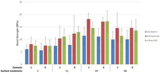 Mean and standard deviations of micro-shear bond strength values (MPa). C, control group; CJ, silica-coated group; HF, hydrofluoric acid etching group; SB, sandblasted group; V, Variolink; B, BisCem.