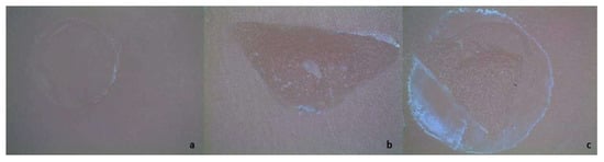Stereomicroscopy photographs of the representative fracture patterns. Adhesive (a), cohesive (b), mix (c).