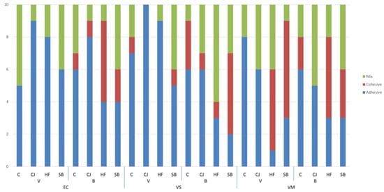 Stereomicroscopy images determined the fracture patterns (Figure 2) and showed that the type of fracture was primarily adhesive failure between the cement and the ceramic material (55.4%), followed by mixed failure (27%), and cohesive failure (17.5%) (Figure 3). No significant difference was obtained between the distribution of the material and cement interaction groups according to fracture type in the C, CJ, and SB surface treatment groups (p values of 0.206, 0.101, and 0.072, respectively). The difference in the distribution of the cement interaction groups based on the kind of fracture was statistically significant in the HF group (HF acid surface treatment) (p < 0.001). This difference is due to the fact that the ratios of the VS-V, VS-B, and VM-V groups differed according to the fracture type.