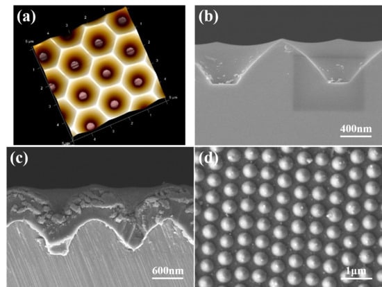 Zn(CH3COO)2-2H2O, C2H7NO, and CH3OCH2CH2OH were used to prepare a 0.2 M solution of Zn2+ ions, which was stirred at 60 °C for 2 h. The solution was left standing for 48 h to obtain a ZnO gel solution. A 2-inch sapphire substrate with a patterned cavity, as shown in Figure 1a,b, was used as template and the Al sacrificial layer was deposited on it. The patterned cavity had a bottom width of 0.37 μm and an average length of 0.48 μm. A 120 nm thick layer of Al was deposited using the evaporation method, and the sapphire template with the Al sacrificial layer was annealed at 500 °C for 1 h with a pressure of 1.2 bar using 90% Ar + 10% H2. ZnO gel was then spin-coated onto the surface of the sapphire template, using a rotation speed of 2000 rpm and a coating time of 30 s. Then, the ZnO gel was coated on Al-coated template and baked for 10 min at 300 °C to dry and harden the coating of ZnO gel. In order to be able to obtain sufficient thickness of ZnO seed layer, we repeated the coating and baking processes six times. A focused ion beam (FIB) system was used to observe the deposited seed layer, as shown in Figure 1c; only nanoscale particles were formed. An optical OE-6370HF AB glue was used as a carrier and coated on the ZnO thin layer, and the prepared multilayer materials were removed by using the lift-off method and imprint lithography. The Al sacrificial layer was etched using a solution of K3Fe(CN)6:KOH:H2O (10 g:1 g:100 mL). The ZnO seed layer was adhered onto a p-type Si substrate, which used OE-6370HF AB glue as adhesive. Then, a seed layer with a patterned and protrusion array structure was created, as depicted in Figure 1d. ZnO NFAs were synthesized using a 0.2 M solution of Zn(CH3COO)2-2H2O at 90 °C for different synthesis times (10, 20, 30, and 60 min). The surface morphologies of prepared seed layer and synthesized ZnO NFAs were observed by a FESEM, while their crystalline phases were analyzed using an X-ray diffractometer. Cross-sectional morphologies were observed using a FIB system. The optical properties of synthesized ZnO NFAs were measured at room temperature using a Horiba Jobin iHR550 fluorescence spectrophotometer in the wavelength range of 350−650 nm, whose excitation light source was a He Cd laser at a single wavelength of 325 nm