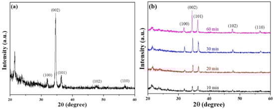 The diffraction peaks of the ZnO seed layer for the (100), (002), (101), (102), and (110) planes were observed at corresponding to 2θ values of 31.9°, 34.6°, 36.5°, 47.6°, and 56.8°, as Figure 2a shows. The highest diffraction peak was observed at 34.6°, which corresponds to the (002) plane and is higher in intensity than the other four diffraction peaks. This result suggests that the characteristic of c-axis preferred orientation exists in the ZnO seed layer even at the nanoscale level. The XRD patterns of the ZnO NFAs synthesized were analyzed as a function of synthesis time, and the results are shown in Figure 2b. All the diffraction peaks presented in the seed layer ((100), (002), (101), (102), and (110) planes) were observed in all synthesized ZnO NFAs, and the diffraction intensity of the (002) plane increased significantly with synthesis time.