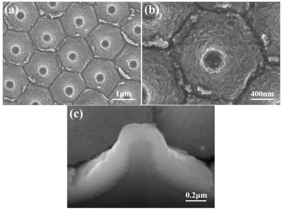 SEM images of an investigated template with (a) a low magnification and (b) a high magnification; and (c) the FIB cross-sectional view of the template.