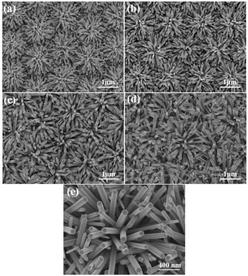 ZnO NFAs synthesized at (a) 10, (b) 20, (c) 30, and (d) 60 min. (e) 60 min-synthesized ZnO NFAs with higher magnification.