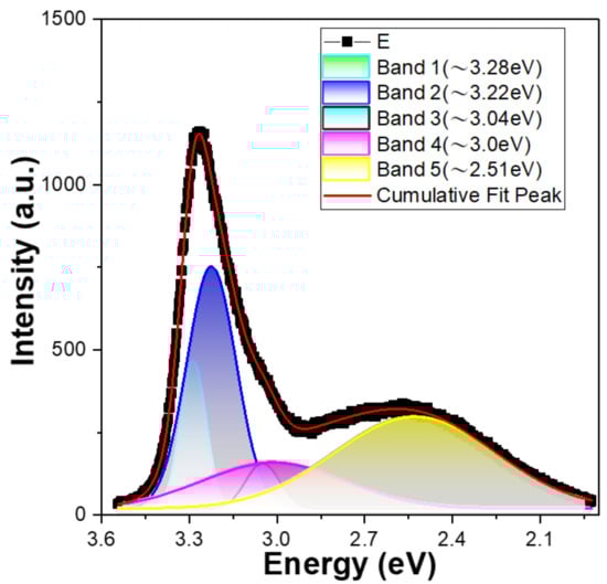 The PL spectrum of 10 min-synthesized ZnO NFAs is shown in Figure 7, with energy plotted on the x-axis (not wavelength). When estimating the PL spectrum of 10 min-synthesized ZnO NFAs, the merged emission profile in the range of approximately 3.54–1.92 eV (350–645 nm) was fitted to a sum of five Gaussian functions located at approximately 3.28, 3.22, 3.04, 3.00, and 2.51 eV, respectively. Notably, the bandwidth and intensity of the band at 3.04 eV were small in the fitting result. Previously, Purbayanto et al. discovered that emission peaks at 3.251 and 3.327 eV are associated with donor–acceptor pair transitions and two-electron satellite transitions [20]. Their findings indicate that the 3.28 eV peak in Figure 7 is likely linked to either donor–acceptor pair or two-electron satellite transitions. The 3.22 eV peak is caused by the near-band-edge emission, while the 3.04 and 3.00 eV peaks are believed to be caused by zinc vacancies and interstitial zinc. Purbayanto et al. conducted H2 annealing and observed that the strong emission at 2.5 eV persisted at room temperature. They suggested that this emission was due to localized states, with oxygen vacancies (VO) identified as the primary localized states. Additionally, they noted that the high defect concentration was responsible for the strong emission at 2.5 eV. However, the relative energy resulting from oxygen vacancies differs from the findings of Lin et al. Consequently, the 2.51 eV peak is attributed to oxygen vacancies produced during the synthesis process. In Figure 6, it can be observed that the intensity of the green emission peak decreases as the synthesis time of ZnO NFAs increases. This indicates that the amount of oxygen vacancies in synthesized ZnO NFAs decreases as the synthesis time lengthens.
