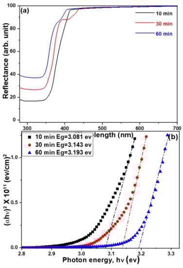 The drawings of the UV–visible diffusion reflectance spectra of ZnO NFAs for samples with different synthesis times are shown in Figure 8a and their corresponding Tauc plots are shown in Figure 8b. UV–visible diffusion reflectance spectra of ZnO NFAs reveal the optical reflectance in the UV region which can be recognized as the migration of electrons from the valance band to the conduction band [12]. These UV–visible spectra reveal that their reflectance rates increase with the synthesis time of ZnO NFAs. The calculated band gaps for samples grown with the synthesis times of 10, 30, and 60 min were 3.081, 3.143, and 3.193 eV, respectively.