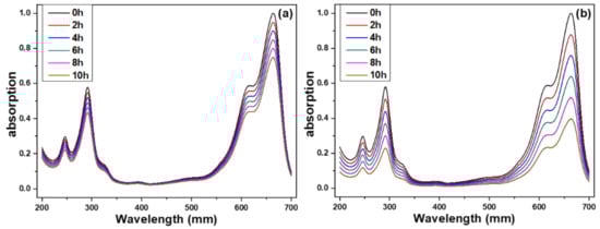 The photocatalytic activity of prepared ZnO NFAs was evaluated by an experiment examining methylene blue degradation by using UV light irradiation. The transmittance spectra of methylene blue solutions using ZnO NFAs synthesized at different times as photocatalytic materials are presented in Figure 9. Methylene blue exhibits three strong absorption bands at 246, 293, and 664 nm, with the strongest absorption occurring at 644 nm. Therefore, the intensity of the 644 nm absorption band was used as a reference for evaluating the degradation results. As shown in Figure 9, the intensities of the entire absorption spectrum and the three absorption bands of methylene blue solution gradually decreased as the UV light irradiation time increased from 0 to 10 h. For instance, when 20 min-synthesized ZnO NFAs were used as photocatalytic materials, the average intensity of the 664 nm band decreased from 94.9% to 90.0%, 84.8%, 80.1%, and 74.9% as the irradiation time of UV light increased from 2 to 10 h (Figure 9a). When using 60 min-synthesized ZnO NFAs as photocatalytic materials, the intensity of the 664 nm band decreased by 87.8% to 75.9%, 63.8%, 51.8%, and 39.6% as the UV light irradiation time increased from 2 to 4, 6, 8, and 10 h (Figure 9b). The experimental result showed that, even when the concentration of methylene blue is 5 ppm, ZnO NFAs synthesized for 30 and 60 min can effectively degrade more than 50% of the methylene blue after 10 h of exposure. These transmittance spectra of methylene blue solutions indicate the degradation effect of ZnO NFAs on the methylene blue solution. The results in Figure 9 demonstrate that different synthesis times result in ZnO NFAs having different morphologies, which in turn produce different degradation effects on methylene blue solution.
